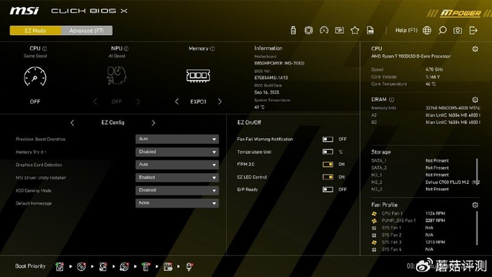 ▼这块主板BIOS的简单界面还是熟悉的风格,只不过感觉细节部分有优化,右下角可以直接显示风扇转速,点小齿轮可以直接进去设置。