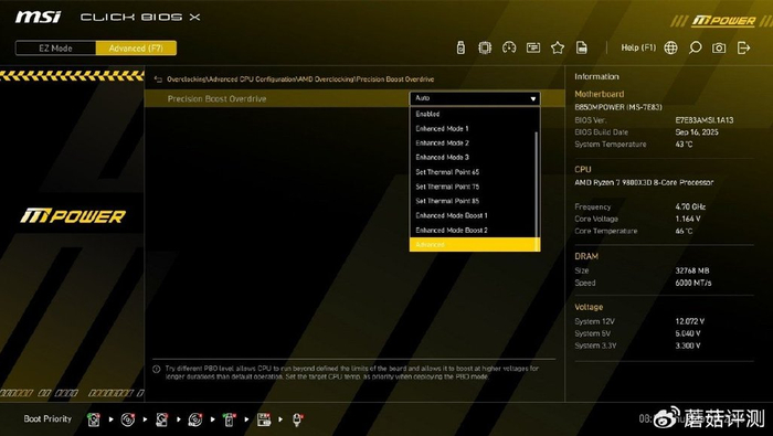 ▼AMD平台最常用的PBO菜单,除了常规的高级设置之外,这块主板还预设了多种模式,其中温度控制模式是蘑菇最喜欢用的。