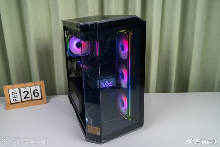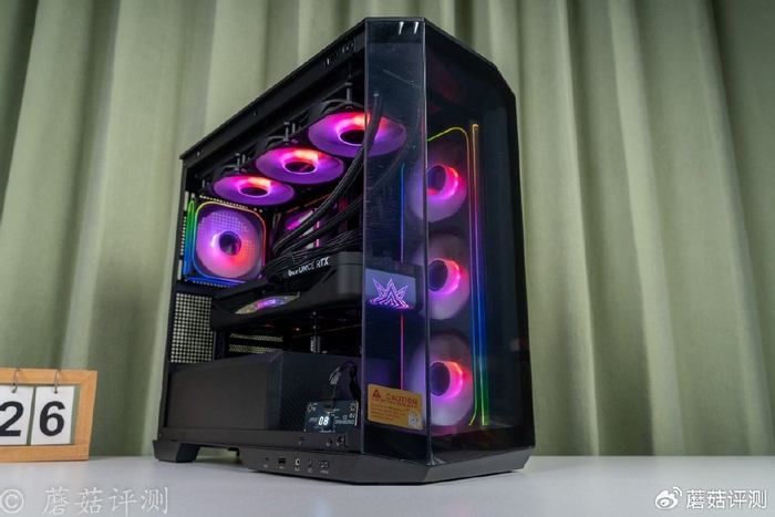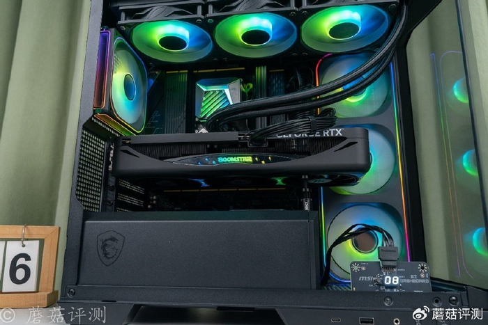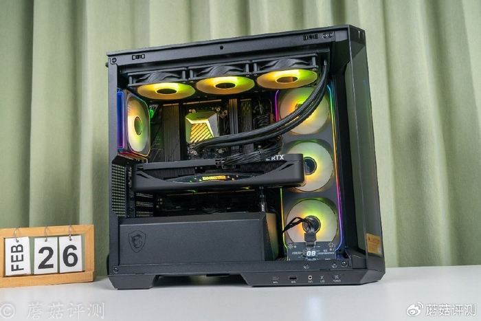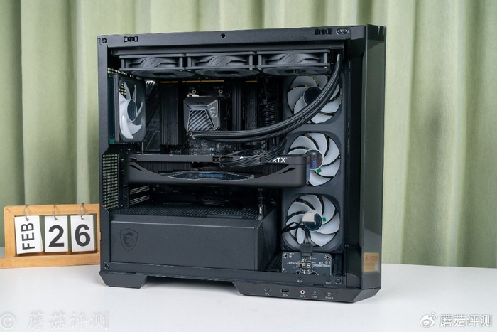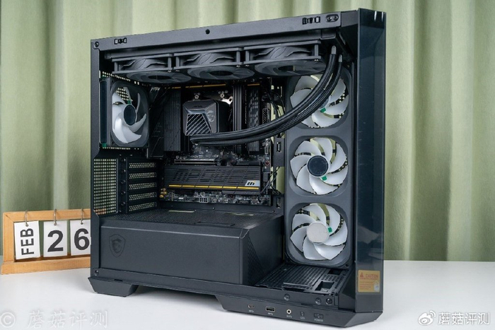 ▼微星这款机箱采用海景房设计,侧面安装一把机箱风扇用于进风,后面安装一把机箱风扇用于出风。