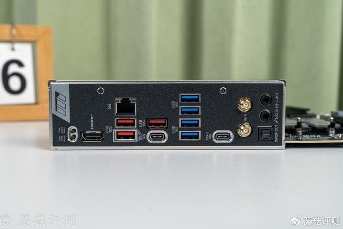 ▼主板后部的IO接口,从左到右依次是BIOS刷写和BIOS清除按键、HDMI视频输出接口、5G有线Lan口、USB3.2 Gen2 Type-A接口3个(其中一个支持BIOS刷写)、USB3.2 Gen2 Type-C、USB3.2 Gen1 Type-A接口4个、USB3.2 Gen2 x 2 Type-C、WIFI天线插座和3个音频接口(其中一个为光纤Lan)。