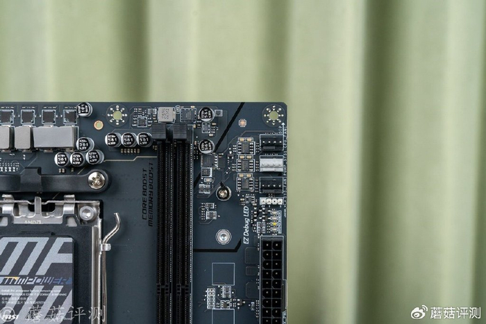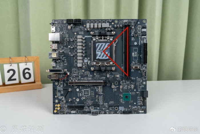 ▼这块主板标配两条内存插槽,且整体的位置和处理器插座一起组成完美的等腰三角形,可以达成DDR5内存的完美布线,从而让其拥有搭配8000系列cpu至高超频10200+MT/s、搭配9000系列cpu至高超频8400+MT/s的好成绩,非常厉害。