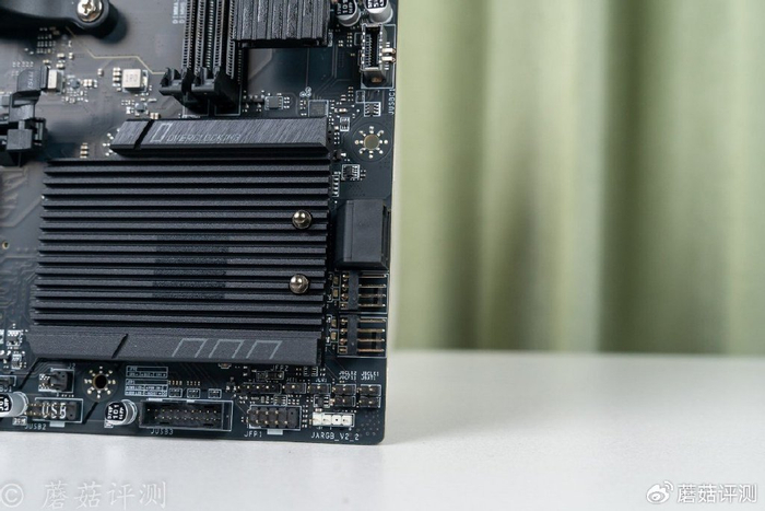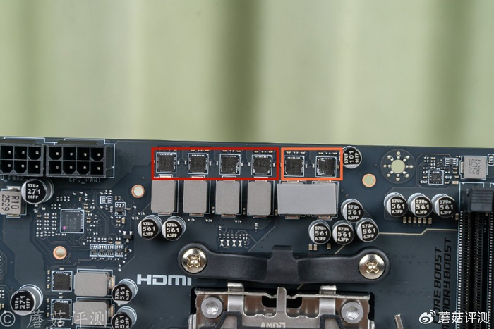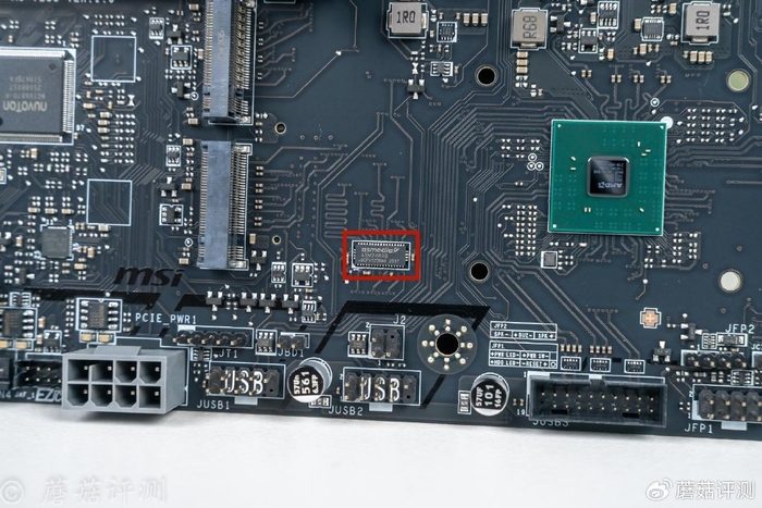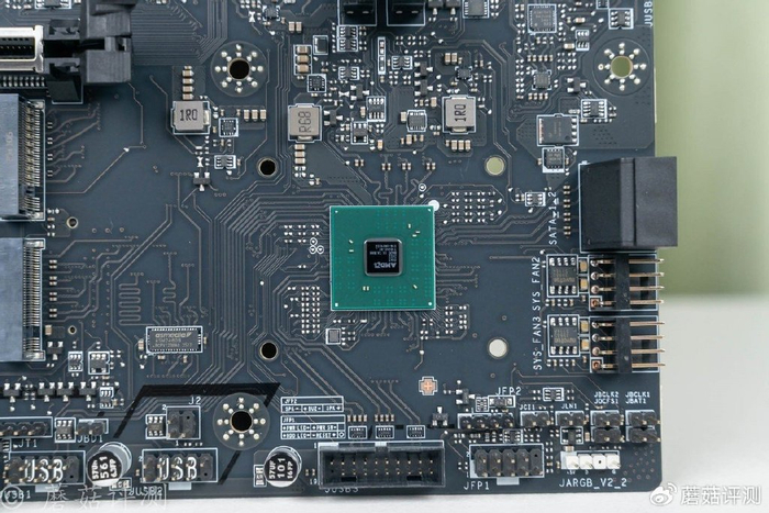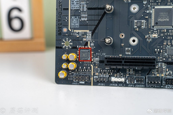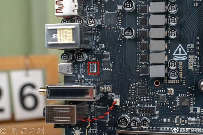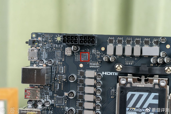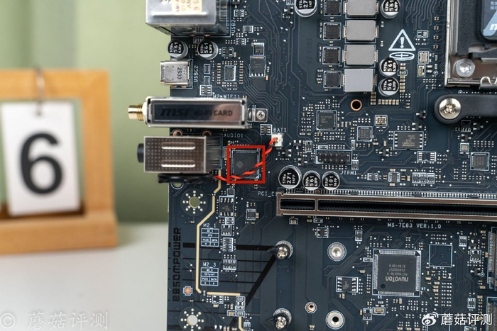 ▼主板底部M2插槽的右侧,红框芯片丝印ASM2480B,这是一颗PCIe 4.0的桥接拆分芯片,蘑菇个人感觉这颗芯片是用于给主板最下面的PCIe插槽和主板背面的M2插槽提供支持的。