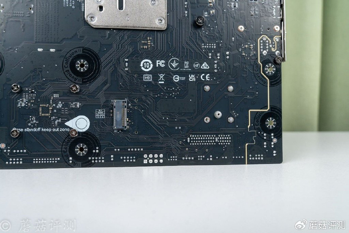 但在这个基础上,这块主板还加入了很多很用心的设计。因为内存插槽为2条,空出的空间就被放置了一个M2插槽,且这个M2插槽是直连CPU、最大支持PCIe 5.0的,且支持快拆,日常使用更方便。主板底部还有两个M2插槽,背面还有一个M2插槽,这块主板标配了4个M2插槽,和很多ATX规格的B850主板保持一致。细节方面,这块主板的PCIe插槽和M2插槽全无冲,可以同时使用,好评!