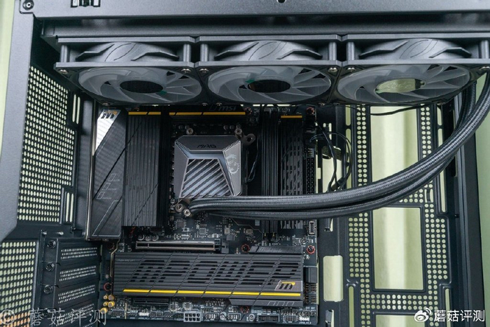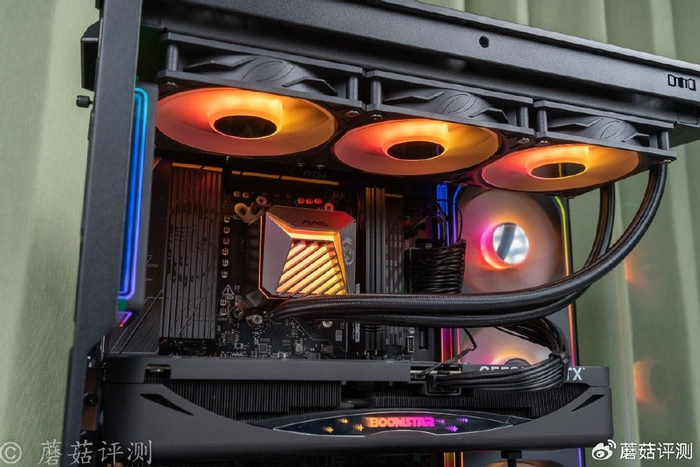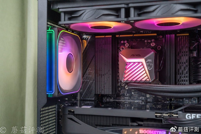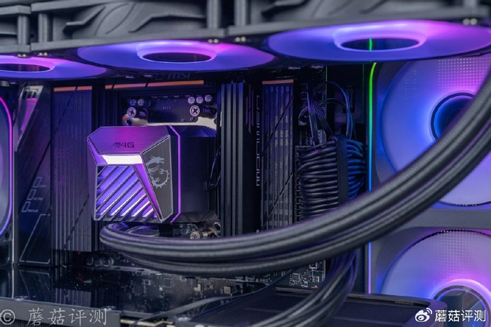 ▼用来压制9800X3D的,是微星的MAG CORELIQUID A15 360冰刃,这款水冷的水冷头采用微星经典的迫击炮风格,搭配大面积的RGB灯效,也很好看。
