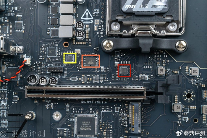 ▼主板的中偏下的位置还有两颗芯片,红框芯片丝印NCT6687D,Super IO芯片,用于检测主板的各项参数;橙框芯片是一颗ARM架构的单片机芯片,用于给主板的RGB灯效提供支持。