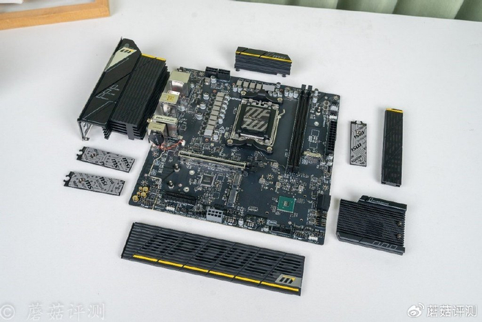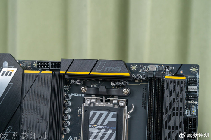 ▼主板的正面外观非常漂亮,有大量的金属件覆盖,且金属件表面的涂装、设计很精致。