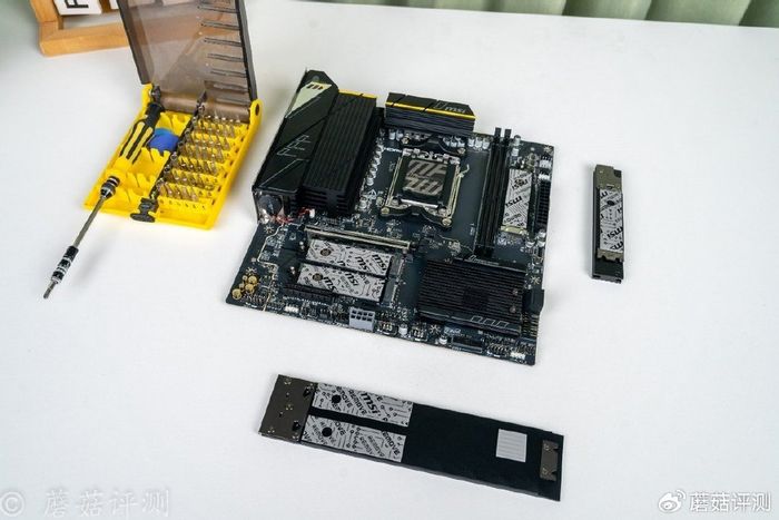 ▼去掉主板正面的金属覆盖件之后,整体的主板结构会更加清晰,这块主板完全就是先摆放的处理器插槽和内存插槽,其余硬件的位置均为这二者让了路,甚至PCIe插槽的快易拆设计都因为让路让没了。