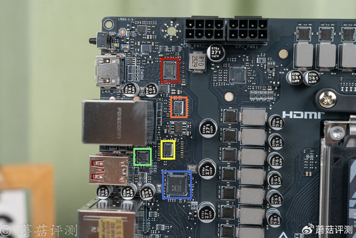 ▼主板后部IO接口旁边芯片众多,红框芯片丝印RTD2151,主要给主板后部的HDMI视频输出接口提供支持;橙框、黄框芯片丝印P13EQX10,给主板后部的USB 3.2 Gen2 Type-A接口提供支持;绿框芯片丝印ASM1543,给主板后部的USB 3.2 Gen2 Type-C接口提供支持;蓝框芯片是小螃蟹家的RTL8126,给主板后部5G的Lan口提供支持。