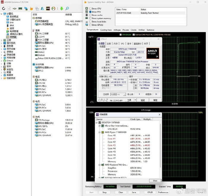 ▼功耗和散热方面,跑个单烤FPU测试,处理器功耗在140W左右,全核心睿频4.5GHz,温度91℃。