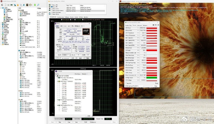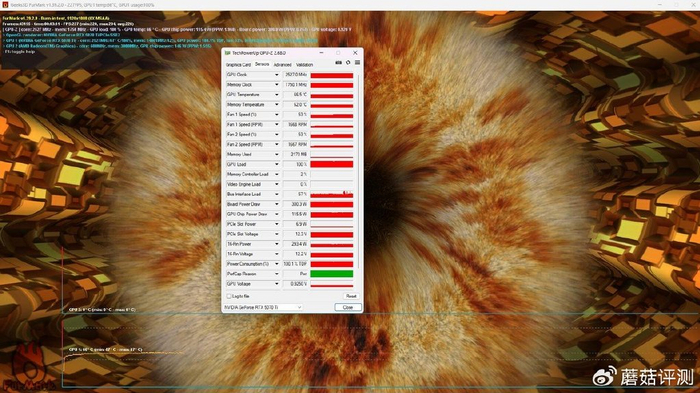▼在跑甜甜圈的同时,单烤FPU测试,处理器功耗在150W左右,全核心睿频4.8GHz,温度95℃。显卡的功耗在290W左右,核心频率2535MHz,温度65.4℃。