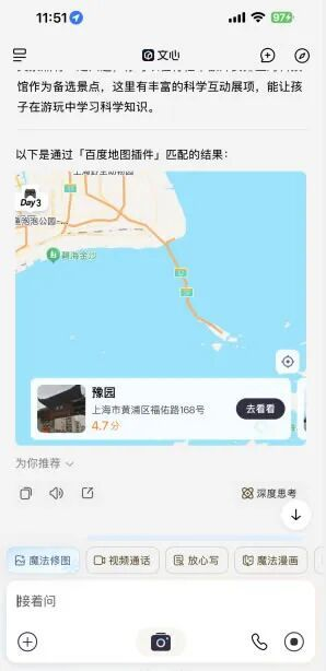 但现在,你只需要对文心说一句:“帮我规划一个适合带娃的上海三天两夜行程。”