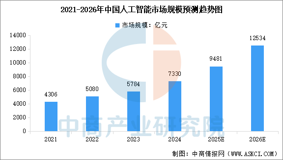 中商情报网讯:人工智能产业正处于技术突破与应用落地的关键阶段,政策支持与竞争并存,未来将加速向智能化、产业化、全球化方向发展。中商产业研究院发布的《2025-2030年中国人工智能产业现状调查及未来趋势研判报告》显示,2024年中国人工智能市场规模已达到7330亿元,同比增长26.7%。中商产业研究院分析师预测,2026年中国人工智能市场规模将达到12534亿元。