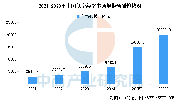 低空经济作为新质生产力的典型代表,正通过“技术-场景-产业”的良性循环,推动经济高质量发展。中商产业研究院发布的《2025-2030年中国低空经济行业市场深度研究及发展前景投资预测分析报告》显示,2024年中国低空经济市场规模达到约6702.5亿元。中商产业研究院分析师预测,2025年中国低空经济市场规模将达到1.5万亿元,2030年市场规模将达到2万亿元。