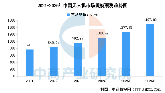 无人机作为低空经济的核心载体,正引领全球范围内的产业变革。近年来,中国无人机市场规模已突破千亿元,并随应用场景拓展持续稳定增长。中商产业研究院发布的《2025-2030年中国无人机行业市场调查及投资建议报告》显示,中国无人机市场规模从2021年的769.80亿元增长至2024年的1108.49亿元,年均复合增长率为12.9%。中商产业研究院分析师预测,2026年中国无人机市场规模将达到1497.02亿元。