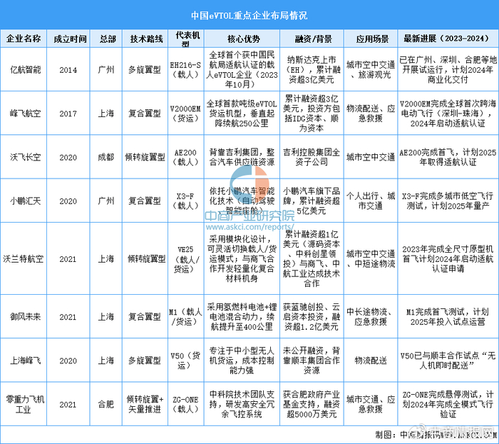 中国eVTOL企业呈现多元化竞争格局,亿航智能、沃飞长空、沃兰特航空、小鹏汇天、峰飞航空等头部企业,通过技术差异(倾转旋翼/复合翼)和场景深耕(载人/物流)抢占市场先机。
