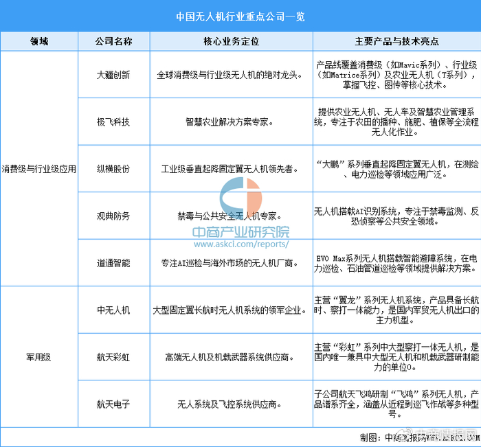 大疆创新在全球消费级与工业级市场持续领先;极飞科技深耕智慧农业;纵横股份等聚焦工业级垂直起降无人机;中无人机、航天彩虹主导高端军用察打一体市场。