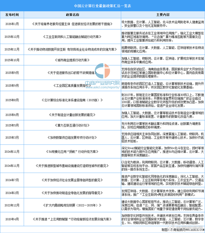 中商情报网讯:云计算作为数字经济的核心基础设施,已被纳入“新基建”、“东数西算”等国家重大工程。国家不仅出台顶层设计文件(如《云计算综合标准化体系建设指南》),还通过具体政策引导数据中心绿色化、集约化发展,并鼓励AI与云计算的深度融合。
