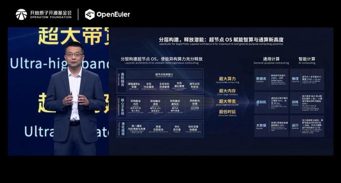 熊伟在演讲中指出业界痛点:“以往不同节点的OS基于网络的资源互访,无法匹配CPU、内存的访问速度,形成了邻国相望,鸡犬之声相闻,民却至老死不相往来的局面”。而这一局面将被openEuler打破——12月底发布的24.03 LTS SP3版本将首次支持超节点,让跨节点资源像本地资源一样高效调度。