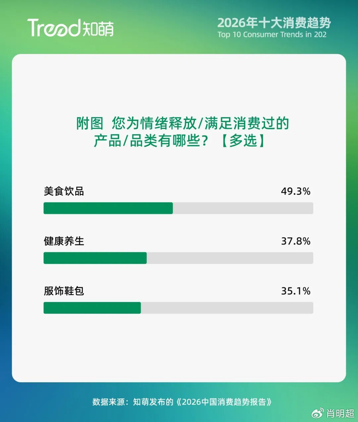 在向外探索、向众共鸣之外,消费者还通过购买那些能直接作用于身心的物品,来营造一个专属于自己的舒适层。美食饮品(49.3%)、健康养生(37.8%)、服饰鞋包(35.1%)是主要的情绪消费品类。