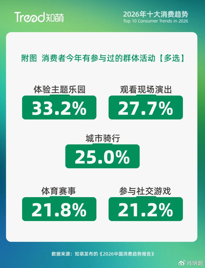 为对抗原子化社会带来的孤独,消费者主动寻求充满共鸣的“集体能量场”。33.2%的消费者参与过主题乐园,27.7%观看过现场演出。在这些场域中,个体情绪得以在群体的欢笑与欢呼中被放大、被确认。