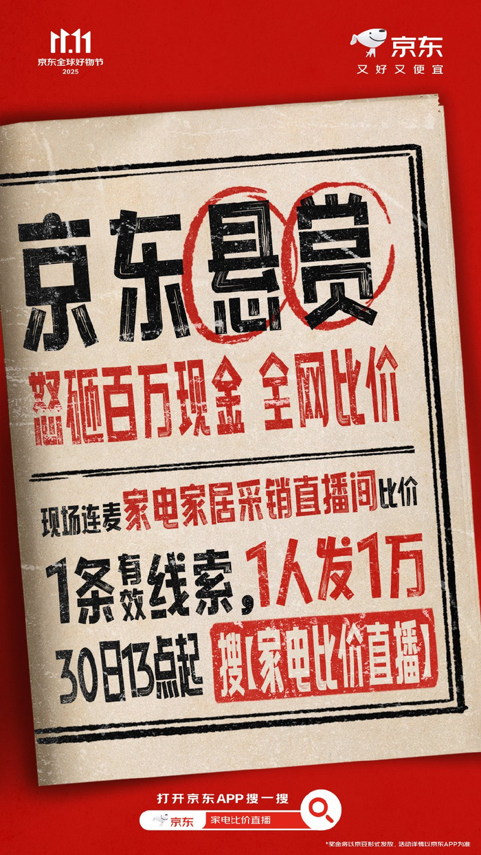 京东自营家电坐镇,拿出100万元现金,向全网发布“比价悬赏令”,让全体网友变身“直播比价官”,僭越全网品牌官方旗舰店,与主播连线提供低价线索,将会给予10000元奖励,以京豆形式发放,并现场调价至9折优惠,部分商品5折价格限量抢购。