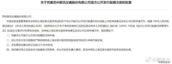 小财米注意到,2026年01月29日,证监会网站披露,同意科创板企业苏州联讯仪器股份有限公司的首次公开发行股票注册的批复。