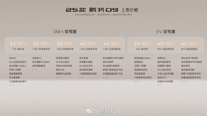 12月26日,“科技豪华全能旗舰MPV”——25款腾势D9重磅上市,推出DM-i超级混动版和纯电版共8个版本车型,官方指导价33.98万元——46.98万元。25款腾势D9在“设计、舒适、驾驭、三电、智能、安全”6大维度全面升级,再立全能MPV标杆!