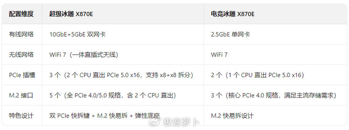 AMD锐龙9 9950 X3D等新世代X3D处理器的登场,让高端AM5主板市场竞争白热化。技嘉顺势推出X870E系列“冰雕双雄”--超级冰雕X870E AORUS MASTER X3D ICE与电竞冰雕X870E AORU SPRO X3D ICE,两款机型均主打纯白美学、X3D优化与易用设计,却在定位、性能和扩展性上各有侧重。本文将从核心参数、设计亮点到场景适配,为玩家拆解这两款“X3D专属座驾”的差异与价值。
