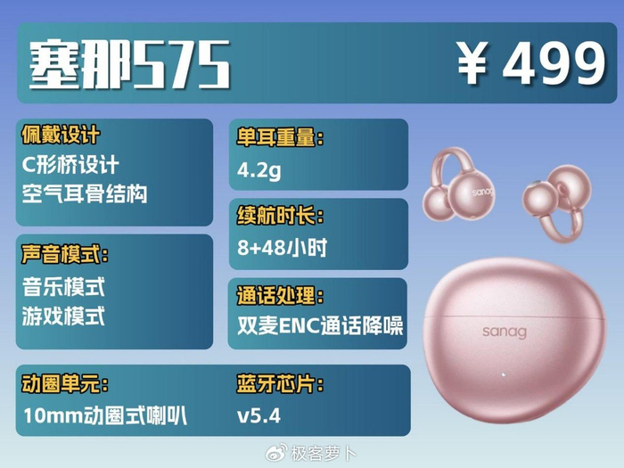 塞那 S7S 的耳夹式设计不错,还加入了轻云舒适科技 6.0。耳机内部用了升级款 0.5mm 超弹性记忆柔丝,再搭配小云朵工程设计和人体工学球形腔体,贴合耳朵且稳固性好;重量上,耳机单耳只有 4.2 克,很轻,戴久了也不会压耳朵。