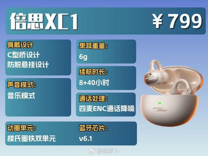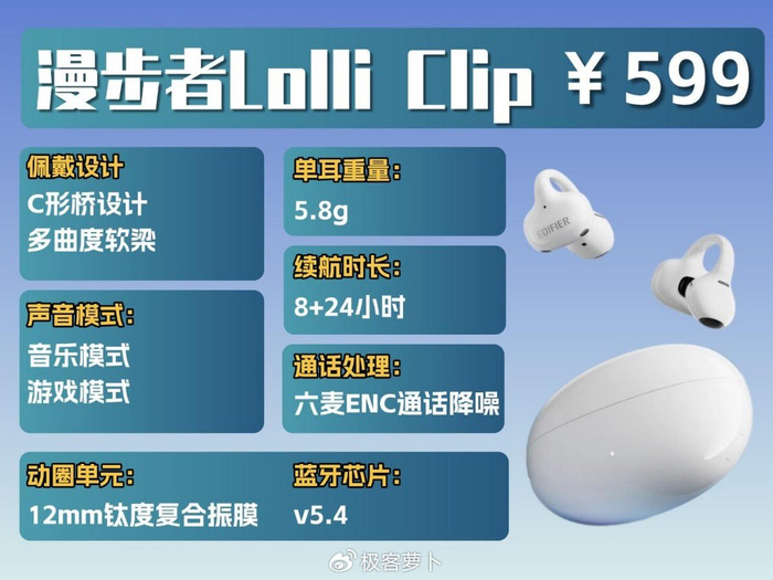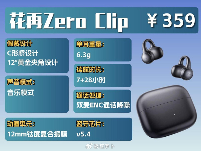 耳夹式设计可以让耳朵可以保持通透,不会有闷得慌的感觉;重量上,耳机单耳约 6.3 克重,戴在耳朵上负担很轻,即便长时间使用,也不会有沉重感或酸痛感。加上“C 型” 内桥外部用了高品质 TPU 材质,触感柔软亲肤,戴久了也不会硌耳;而且还有 12° 黄金夹角设计,既能牢牢贴合耳部,又能保证舒服度,佩戴体验特别好。