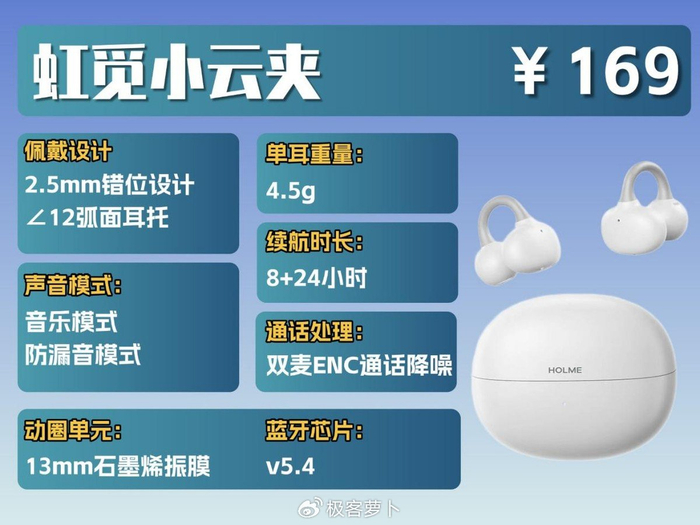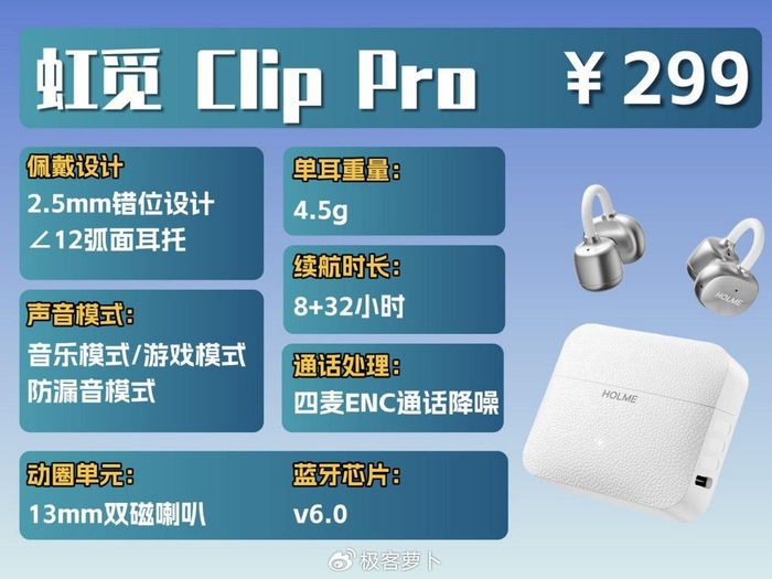 虹觅这款的佩戴舒适度真的非常好,耳机采用 2.5mm 错位设计,戴在耳朵上是前高后低的状态,很贴合耳朵形状,佩戴稳固性好。而且它还有∠ 12° 弧面耳托,把耳机电池部分做成弧形,能贴紧耳背,提升佩戴舒适度。单个耳机只有 4.5 克,佩戴很轻松。虹觅 HOLME Clip Pro 有自研的防漏音模式,打开后,基本不会有漏音,就算在比较安静的图书馆里也不会吵别人。耳机用的是最新的蓝牙 6.0 芯片,连接非常稳定,不容易断连。