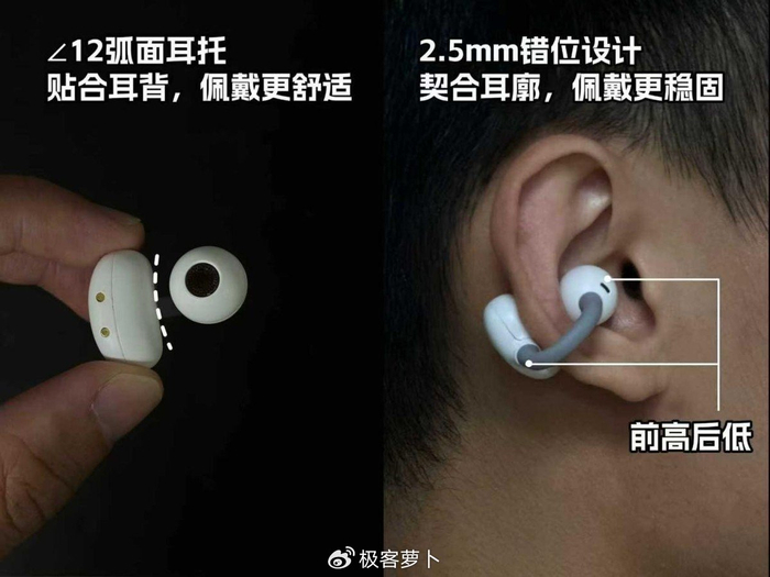 这款耳机的佩戴设计也有讲究。采用戴起来是前高后低的 2.5mm 错位结构设计,能贴合耳道轮廓,不容易滑落。电池部分做成了∠12 弧面耳托,能自然贴在耳背上,佩戴起来非常舒服。单耳只有 4.5g,戴起来很轻松。