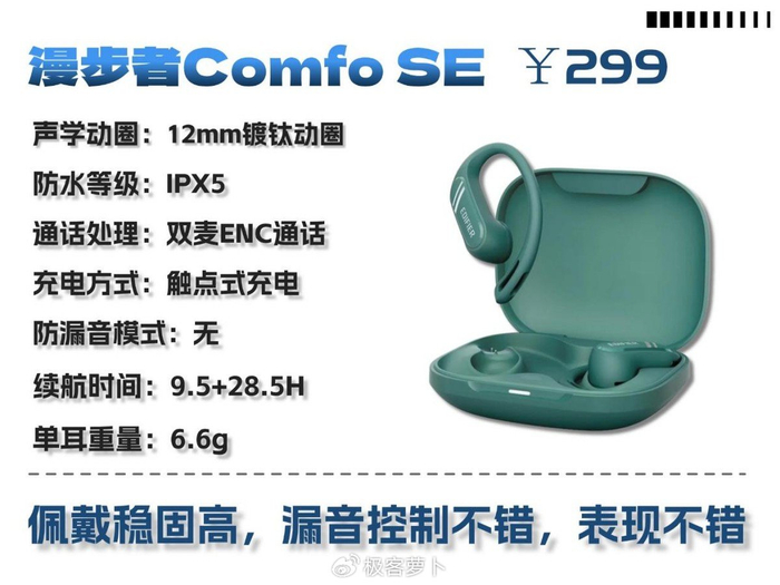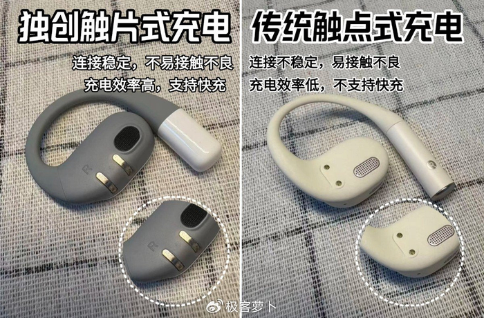 这款耳机戴得特别稳,三点支撑设计能牢牢贴在耳朵上,就算快速摇头也不会掉。单只 6.6 克,戴久了也没不适感,就是耳挂材质有点硬,连续戴四五个小时后,耳朵可能会有一点点压痕。