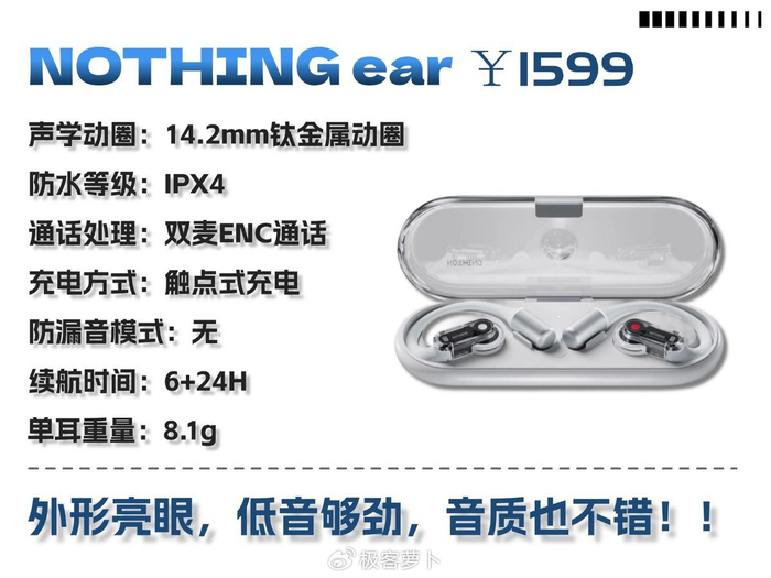 音质方面,14.2mm 的钛金属动圈表现中规中矩,高音清晰,低频增强算法让低音更有力,听节奏感强的音乐还不错,但和旗舰款比,细节还原稍差一些,对音质要求高的话,可能会觉得差点意思。续航方面,单耳 6 小时加上充电盒 24 小时,日常短时间用没问题,要是长时间外出,可能需要中途充电。而且防水等级只有IPX4,只能防轻微溅水,用的时候得注意点。不过这款耳机最吸引我的是外观,科技感很强,颜值很高,像我这种看重设计的人,一眼就喜欢上了。