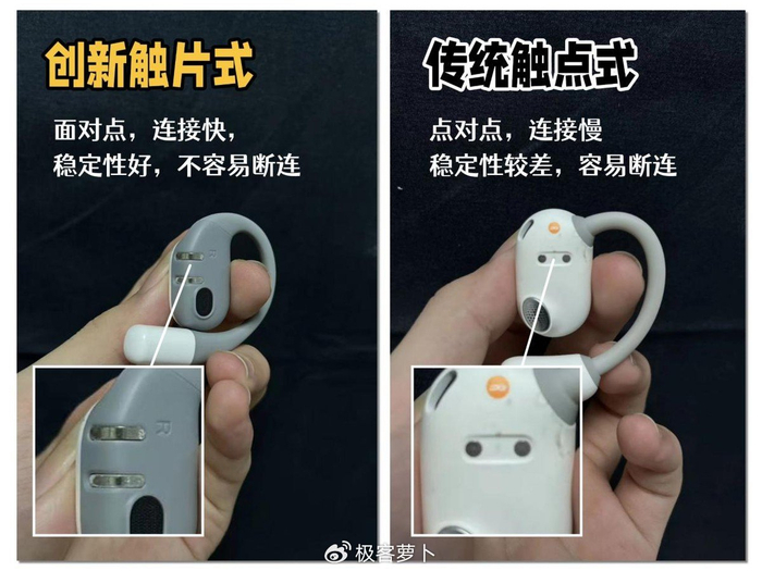 一种是空气传导耳机,借助特殊的结构设计,直接将声音传递到耳朵旁边,全程无需堵塞耳道;