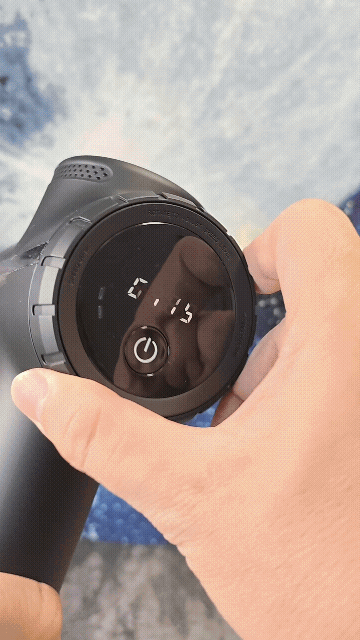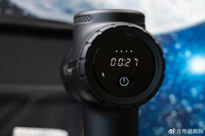 按键以及屏幕均位于筋膜枪的背部,未野ProMax配备了一颗电源按键以及一个用于档位调节的无极旋钮,中央的屏幕可以用于显示工作时间,此外还有档位指示灯与电量指示灯。这款筋膜枪的操控方式非常简单,特别是旋钮调整设计很好用,能够快速在不同档位之间进行调整,总共提供了16个不同力度的档位可以选。