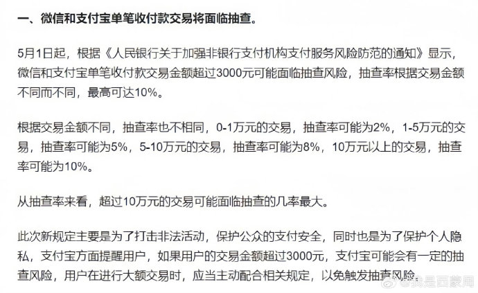 单笔转账3000元以上会面临风险抽查,最高单笔10万元以上会面临10%的抽查率。