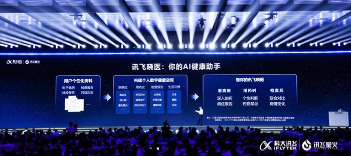 面向专业领域的个性化应用,科大讯飞升级讯飞晓医App,发布个人数字健康空间,打造每个人、每个家庭的AI健康助手。据刘庆峰介绍,个人数字健康空间可以根据电子病历、检查报告、体检报告等用户个性化资料,构建个人数字健康空间,在看病前可以进一步剖析病症原因,用药时给出药物禁忌的个性判断,在检查后联合对比给出数据变化,并通过角色切换,了解其他家庭成员的健康状况。