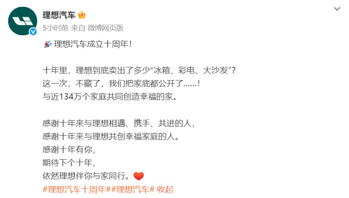 时间过得很快,作为最早一批成立的造车新势力,理想汽车已走过十周年。今天,理想官微发文回顾过去十年,称感谢与近134万个家庭共同创造幸福的家,并期待下个十年依然伴你与家同行。