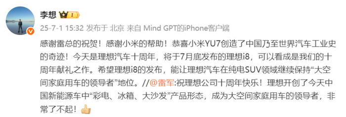 而李想也给予积极回应,“感谢雷总的祝贺!感谢小米的帮助!恭喜小米YU7创造了中国乃至世界汽车工业史的奇迹!今天是理想汽车十周年,将于7月底发布的理想i8,可以看成是我们的十周年献礼之作。希望理想i8的发布,能让理想汽车在纯电SUV领域继续保持‘大空间家庭用车的领导者’地位。”