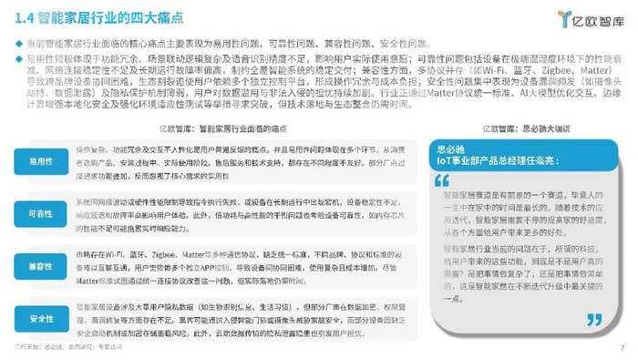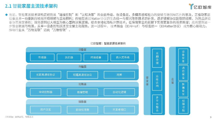 《2025中国智能家居行业技术服务商研究报告》显示,中国智能家居行业正迎来技术突破与市场爆发的关键阶段。报告指出,随着传感器技术、短距离通信、云计算及AI技术的深度融合,智能家居系统已从单一设备控制向全场景智能服务演进。华为、小米等科技企业通过整合硬件、软件与服务,构建了一体化解决方案,大幅降低了用户接入智能家居的门槛。例如,小米通过生态链模式整合超400家合作伙伴,覆盖95%以上的生活场景,展现了生态化布局的潜力。然而,行业快速发展也面临挑战,包括数据隐私合规、设备兼容性及用户体验优化等问题。报告预测,未来智能家居将与保险、零售等行业深度融合,通过跨行业合作探索新商业模式。同时,生物识别、区块链等前沿技术的应用,将进一步提升智能家居的安全性与智能化水平,推动行业迈向全场景智能时代。