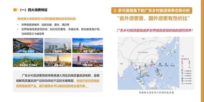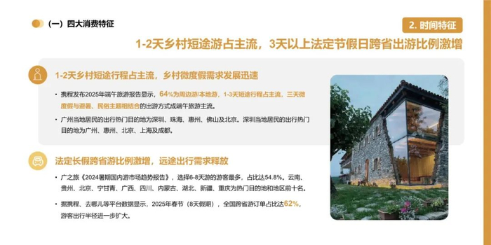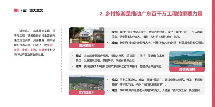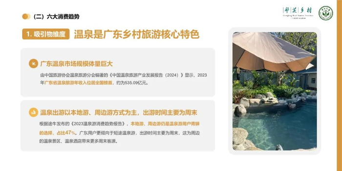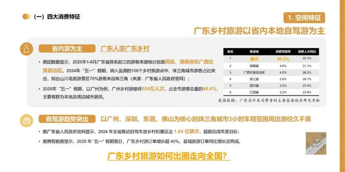 报告指出,广东乡村旅游呈现四大特征:省内自驾游为主,珠三角 3 小时车程圈成热门;1-2 天短途游占主流,法定长假跨省游激增;19-35 岁青年为消费主力,“新中年” 家庭游与银发错峰游凸显;消费更重体验与社交。六大趋势中,温泉旅游年收入居全国榜首,非遗民俗游(如英歌舞播放量超 45 亿次)、滨海旅游引北方及港澳游客热潮,夜间经济与数字游民旅居成新增长点。针对有效供给不足等问题,报告建议通过塑造乡村 IP、数字化运营、补齐基建等提升竞争力,助力乡村振兴。