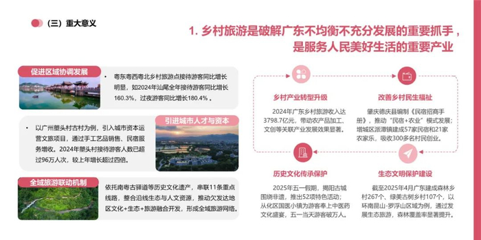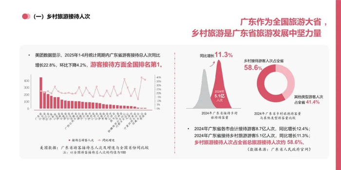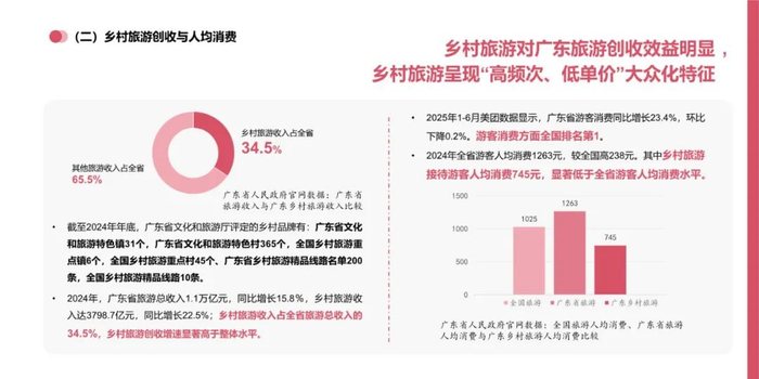 2025 年 6 月,广东省乡村旅游协会联合多机构发布《2025 年广东省乡村旅游消费趋势报告》,揭示乡村旅游在 “百县千镇万村高质量发展工程” 背景下的新态势。数据显示,2025 年 1-6 月广东乡村旅游接待人次同比增长 22.8%,全国排名第一,2024 年乡村旅游收入达 3798.7 亿元,占全省旅游总收入 34.5%,成为旅游发展中坚力量。