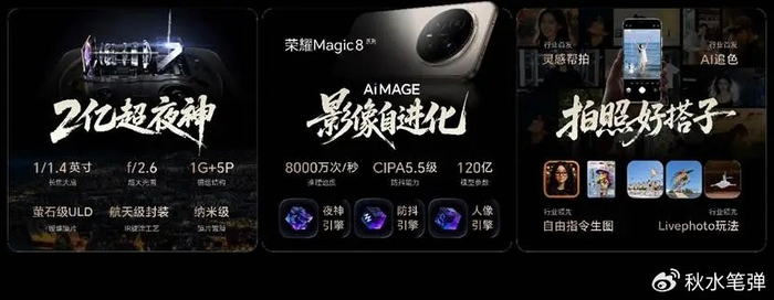 影像与性能同步跃升。Magic8 Pro配备2亿超夜神长焦,结合AiMAGE影像系统的夜神、防抖等引擎,实现夜景与人像拍摄突破,更有AI追色等创作功能。全系搭载第五代骁龙8至尊版芯片与7000mAh青海湖电池,配合120W快充,性能与续航表现亮眼。