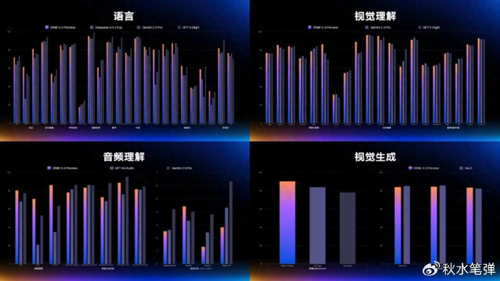 文心5.0基础能力全面升级,在多模态理解、指令遵循、创意写作、事实性、智能体规划与工具应用等方面表现突出,拥有强大的理解、逻辑、记忆和说服力。在40余项权威基准的综合评测中,其语言与多模态理解能力与Gemini-2.5-Pro、GPT-5-High等模型持平,图像与视频生成能力与垂直领域专精模型相当,达到全球领先水平,验证了原生全模态大模型的能力和潜力。