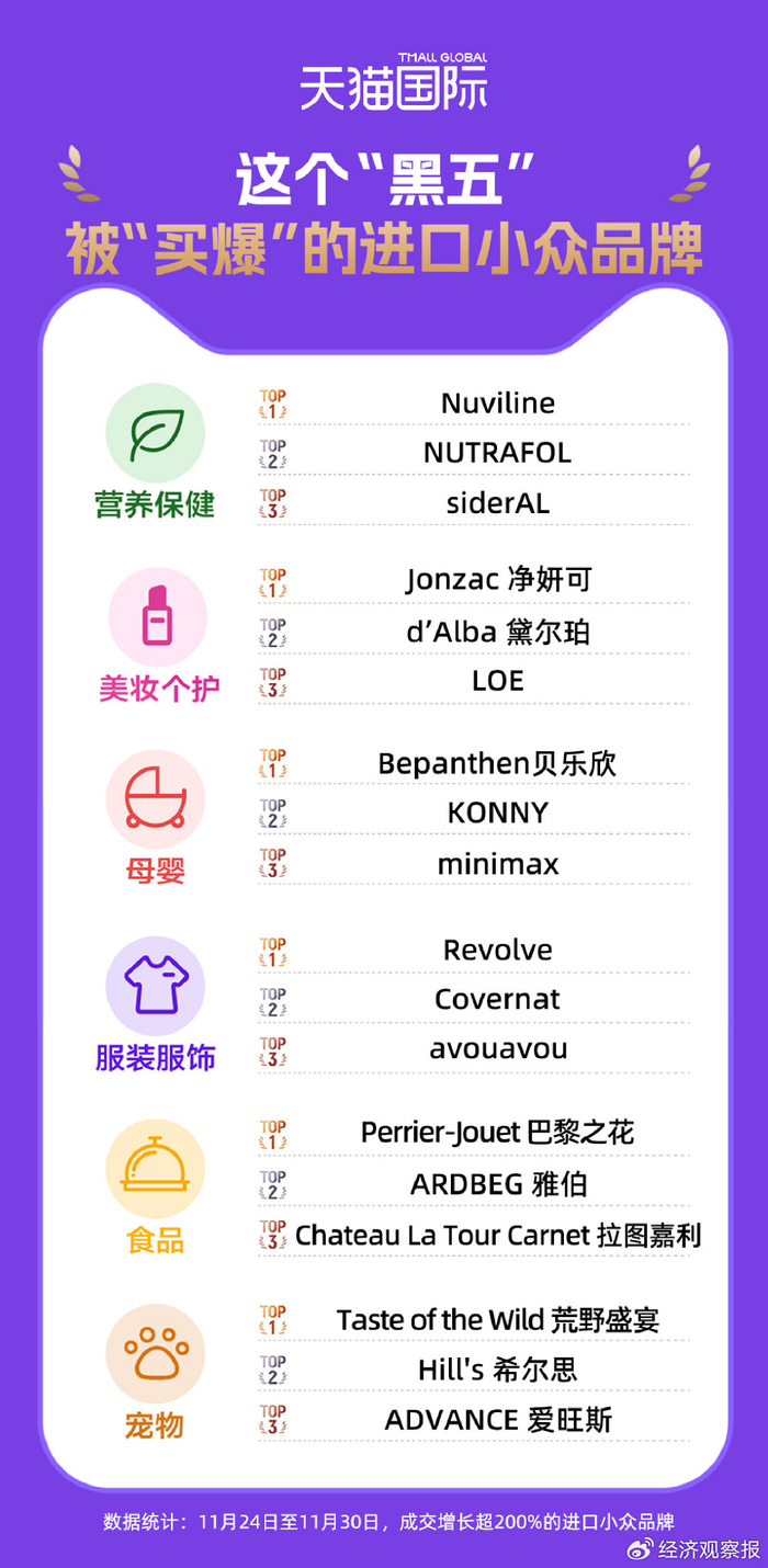 天猫国际盘点了今年“黑五”期间表现亮眼的进口小众品牌,美国健发品牌NUTRAFOL、韩国沙龙香氛品牌LOE、意大利补铁品牌SiderAL等首次进入中国,或仍在建立市场认知度的品牌,成交均翻两倍以上。