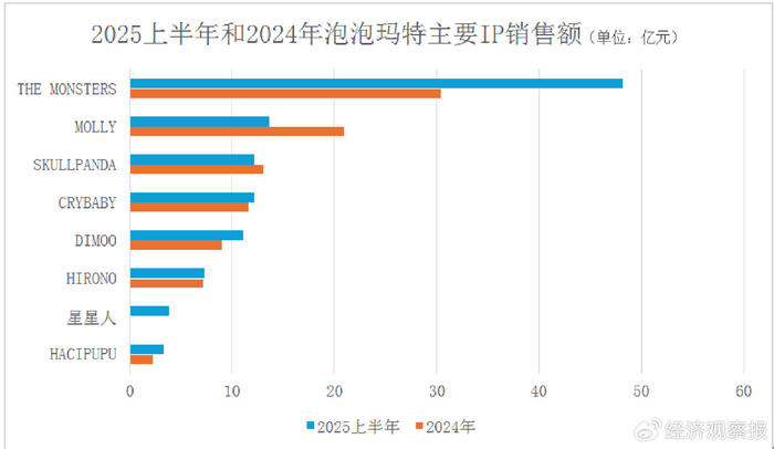 需求的相互依赖性,不仅体现在同款IP,还能带动公司旗下其他主要IP销量增涨。多款IP2025年上半年的销售额超过去年全年,前5大IP的年销售额均超过10亿元,加起来的销售占比超过70%。其中,LABUBU同期销售额为48.1亿元,在公司销售总额的占比超过三分之一。