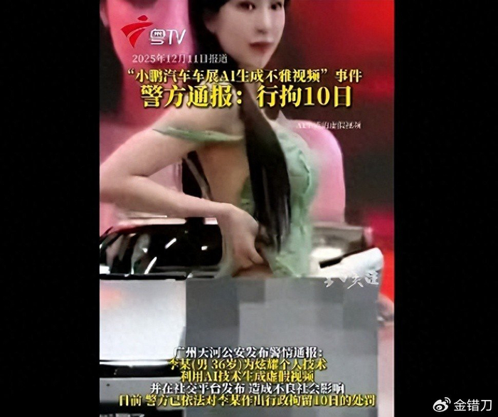 小鹏汽车迅速报警,最终查明这竟是AI生成的虚假视频,制作人李某仅为“炫耀个人技术”,最终被处以行政拘留10日的处罚。