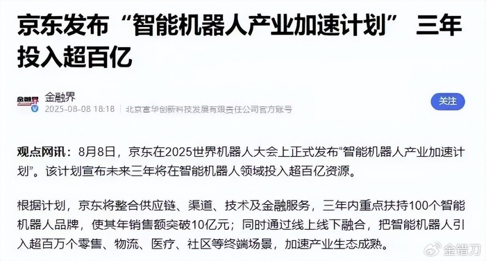在2025世界机器人大会上,京东直接抛出“智能机器人产业加速计划”,砸超百亿资源,目标三年内帮100个机器人品牌销售额破10亿。