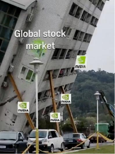 在内部会议上,黄仁勋提到一个网络梗图,几根绝望的杆子苦苦支撑一栋倾斜严重的大楼,大楼是“全球股市”,杆子全是“英伟达”。